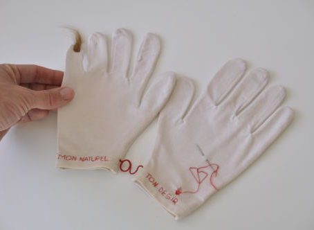 Deux gants sont attachés l’un à l’autre, partie d’un même être les mains comme miroir de l’âme?